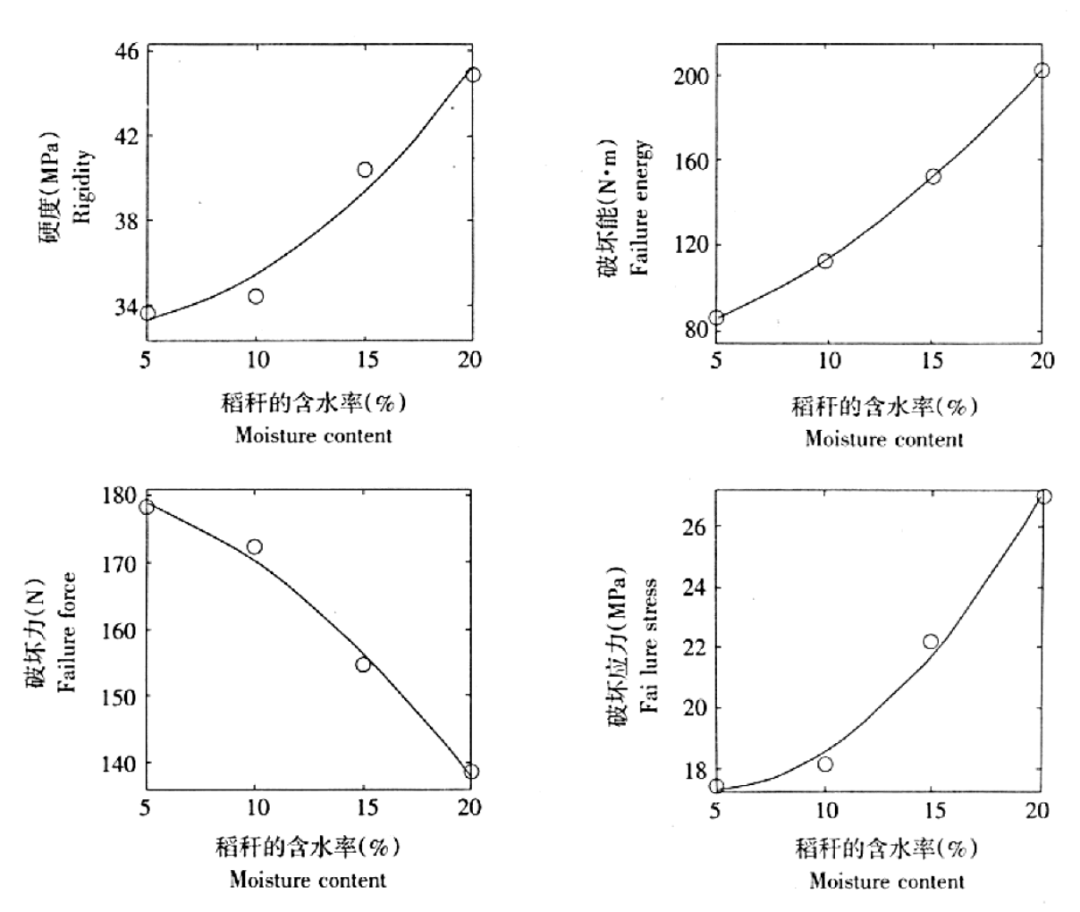 測定和研究稻草秸稈中的機(jī)械特性可以為其機(jī)械加工設(shè)計(jì)提供理論參數(shù),東北農(nóng)業(yè)大學(xué)的孫占峰和華南農(nóng)業(yè)大學(xué)的蔣恩臣使用萬能試驗(yàn)機(jī)對稻草秸稈進(jìn)行了壓縮、彎曲和剪切試驗(yàn)。試驗(yàn)包括橫向壓縮、軸向壓縮和剪切試驗(yàn)、彎曲試驗(yàn)三大類。其中分別對根部莖稈、下部節(jié)莖稈、中部莖稈、上部節(jié)莖稈、稍部莖稈進(jìn)行測試和數(shù)據(jù)處理。試樣的物理特性參數(shù)包括外徑、內(nèi)徑、橫斷面面積、含水率等。試驗(yàn)中試樣的變形范圍為0~10 mm,力的變化范圍為0~100 N。通過計(jì)算機(jī)自動(dòng)采集數(shù)據(jù)可直接得出力-變形曲線。作者在較后通過多項(xiàng)式回歸還分析建立了稻草秸稈的擠壓、彎曲和剪切力學(xué)指標(biāo)隨含水率變化關(guān)系的數(shù)學(xué)模型。