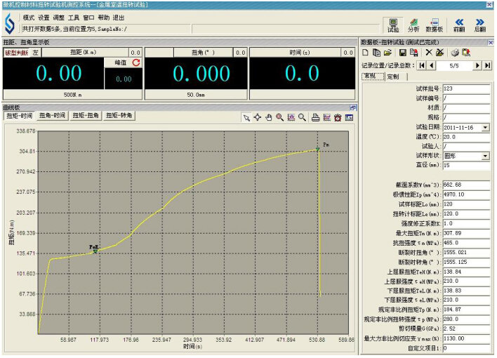 2.1主機:采用臥式結構,主體結構采用臥式框架結構,以保證整機的剛性。夾具采用優(yōu)質(zhì)合金結構鋼淬火(HRC45~50)方式,主傳動軸采用合金結構鋼淬火處理,保證其使用壽命。試樣的安裝、拆卸方便、快捷。夾頭的活動端采用精密重型導軌,使其能自由移動,將試件的軸向拉力減少到最小。 試件徑向載荷的加載,采用全數(shù)字交流伺服電機驅(qū)動,精密行星齒輪減速機傳動方式,使其實現(xiàn)閉環(huán)控制。加載能力最大10kN。 2.2驅(qū)動系統(tǒng):由日本進口全數(shù)字交流伺服控制系統(tǒng)驅(qū)動。速度調(diào)節(jié)范圍寬,加載均勻、穩(wěn)定。 2.3傳動系統(tǒng):采用行星擺線針輪減速器傳動,保證傳動的均勻、穩(wěn)定及傳動精度。橫向空間0~600mm范圍內(nèi)任意手動調(diào)節(jié)。徑向載荷的加載位置,可以在試件的長度范圍內(nèi)隨意調(diào)整。 2.4測量顯示系統(tǒng):該機采用光電編碼器采集試樣的扭轉(zhuǎn)角度,高精度扭矩傳感器采集試樣的扭矩,高精度扭轉(zhuǎn)計測量試樣的扭轉(zhuǎn)變形。計算機屏幕顯示試樣的扭矩、扭轉(zhuǎn)角度、扭轉(zhuǎn)變形以及各類曲線等。也可以顯示扭矩—徑向載荷曲線。 2.5軟件操作: ①控制模式采用智能專家設置系統(tǒng),用戶可以根據(jù)自己的實際要求編制試驗過程控制方式,自動完成試驗。 ② WinXP全中文界面,人機對話方式。試驗的全部操作均借助鍵盤及鼠標操作,通過計算機鍵盤與鼠標完成,計算機屏幕顯示試驗扭矩T,扭轉(zhuǎn)角度θ,各種試驗曲線(扭矩—徑向載荷、扭矩-時間曲線、扭矩-角度曲線、角度-時間曲線等)試驗機工作狀態(tài)等。 ③曲線坐標的大小可以根據(jù)實際的試驗數(shù)據(jù)進行調(diào)整。 ④輸出打印各種試驗報表格式(報表格式可以Excel或Word格式輸出)。 ⑤符合JB/T9370—1999《扭轉(zhuǎn)試驗機技術條件》及GB/T10128—2007《金屬室溫扭轉(zhuǎn)試驗方法》數(shù)據(jù)處理的相關要求。 ⑥可以檢測試件的屈服點τs、上屈服點τsu、下屈服點τsl、抗扭強度τb等。扭矩和扭轉(zhuǎn)角自動跟蹤測量,并顯示試驗曲線。顯示試驗的扭矩值、扭轉(zhuǎn)角、扭轉(zhuǎn)速度。 試驗結束后,自動進行試驗數(shù)據(jù)處理,能自動求取材料的切變模量G、規(guī)定非比例扭轉(zhuǎn)應力τp、屈服點、上屈服點τsu、下屈服點τsl、抗扭強度τb等性能參數(shù)。能根據(jù)用戶要求可隨意編制報告格式并可輸出打印試驗報告。 ★試驗過程可以實現(xiàn)模擬再現(xiàn)。 ★試驗機可以實現(xiàn)連續(xù)加載和任何負荷下保持載荷兩種功能。試驗過程中無沖擊和震動,具有良好的讀數(shù)穩(wěn)定性。 ★可以任意多條試驗曲線疊加對比、輸出打印。 ★可以進行數(shù)字化調(diào)零和標定。 ★試驗數(shù)據(jù)采用數(shù)據(jù)庫管理方式,便于查詢和維護。 ★軟件系統(tǒng)的操作可以實現(xiàn)三級用戶管理,安全、方便、快捷。 試驗操作界面如下: